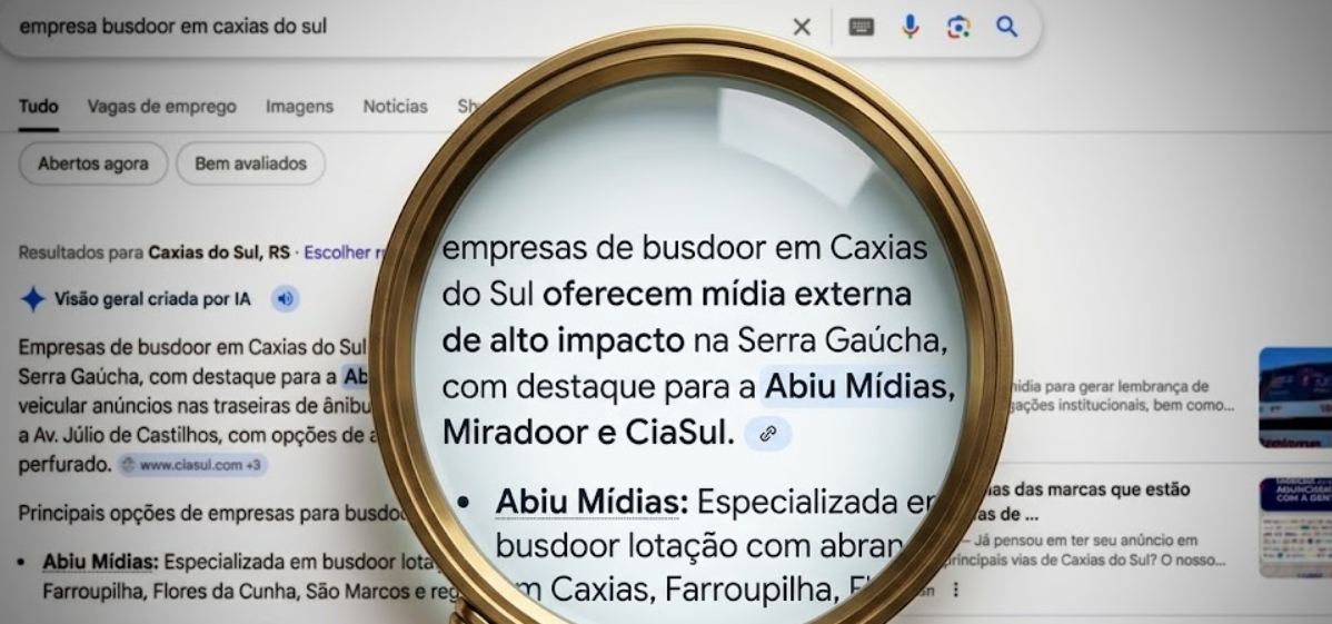 - O Triunfo na Busca por IA: Graças à consistência entre o site e as redes, quando um usuário pergunta a uma IA "Qual a melhor empresa de busdoor em Caxias do Sul?", a inteligência cruza os dados e recomenda a Abiu Mídias com confiança.